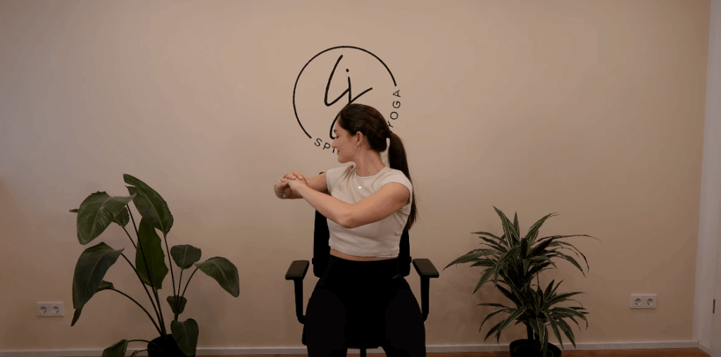 Dein Po bleibt dabei tief auf dem Stuhl und nur dein Oberkörper legt nach außen, sodass du eine sanfte Dehnung in deiner Seite spürst, die oft so vernachlässigt wird, wenn wir den ganzen Tag sitzen.
